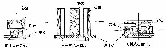 手工制芯由于无需制芯设备,工艺装备简单,应用得很普遍。根据砂芯的大小和复杂程度,手工制芯用芯盒有整体式芯盒、对开式芯盒和可拆式芯盒,如图7所示。
